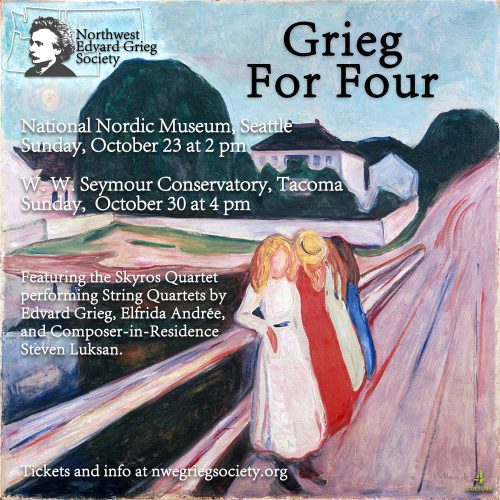 Known for their “innovative and interactive approach to classical music both old and new” (Second Inversion) the Seattle-based Skyros Quartet will bring Edvard Grieg’s String Quartets to life. Programmed are both his String Quartet No. 1 in G minor, Op. 27 and the two finished movements of this String Quartet No. 2 in F major, […]